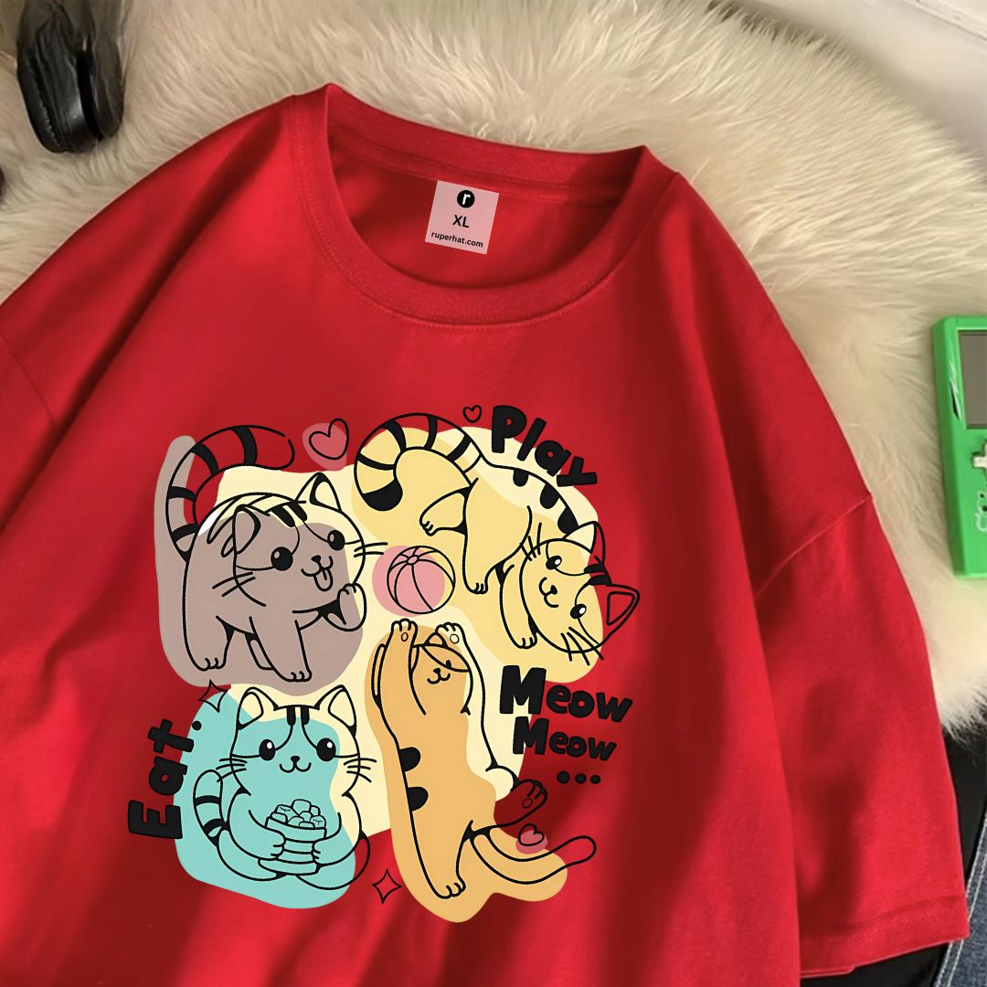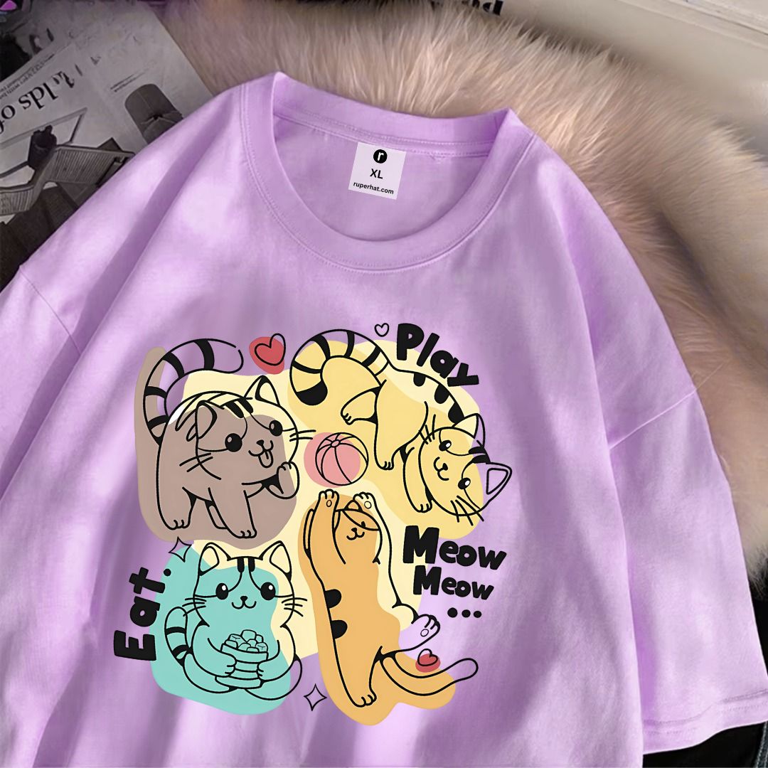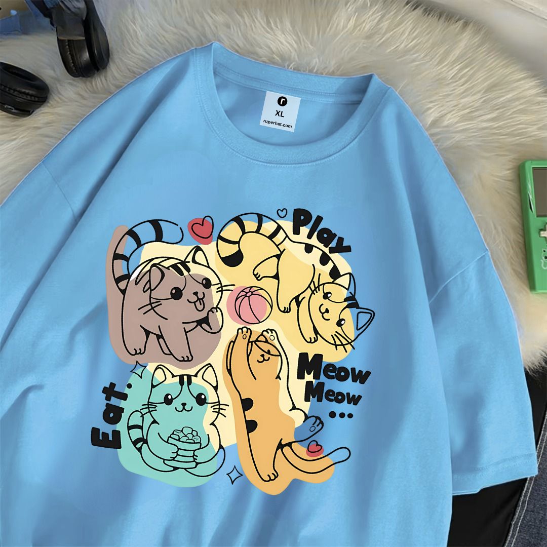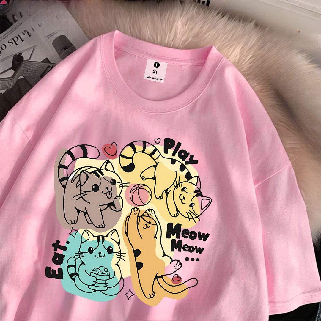 Cat Play Eat Meow Drop Shoulder T-Shirt