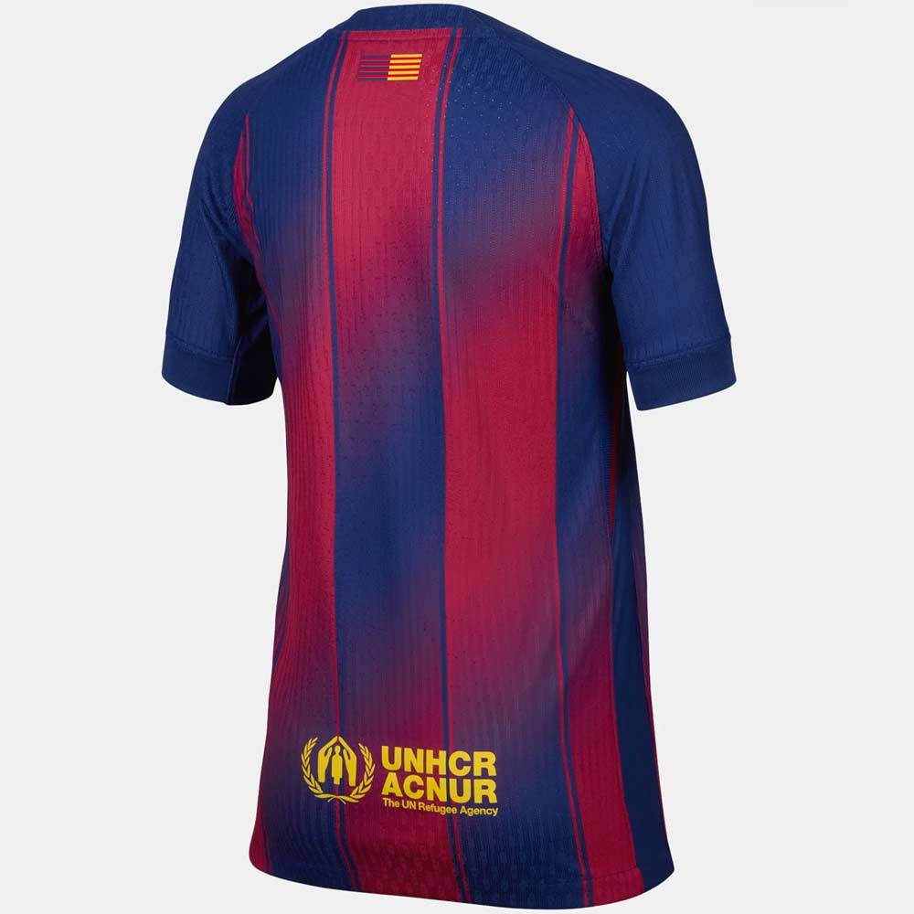 The Nike Barça 2025-2026 home football shirt has a unique design with the traditional red and deep blue vertical stripes – there is a gradual transition between the stripes towards the center of the shirt, creating a one-of-a-kind look.
