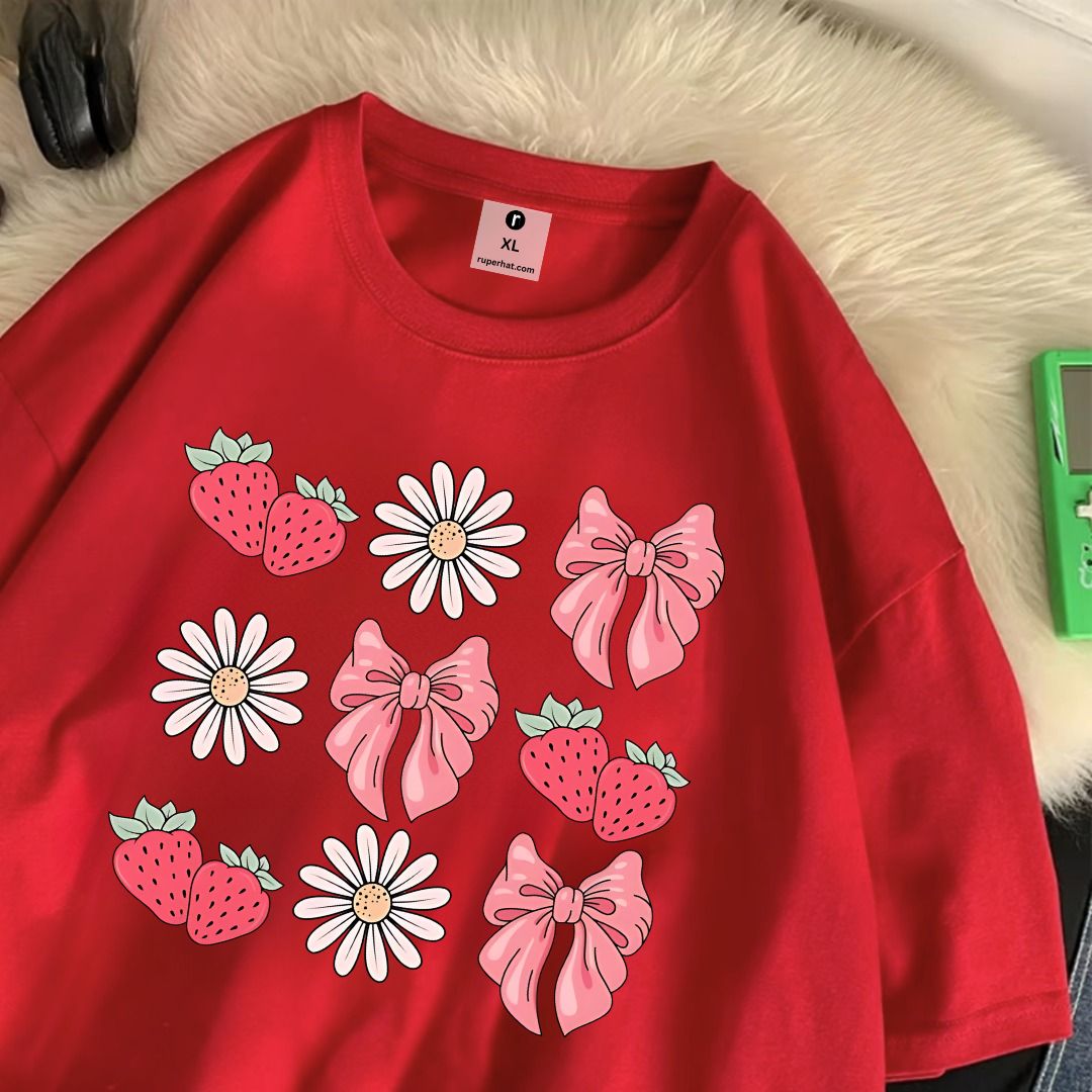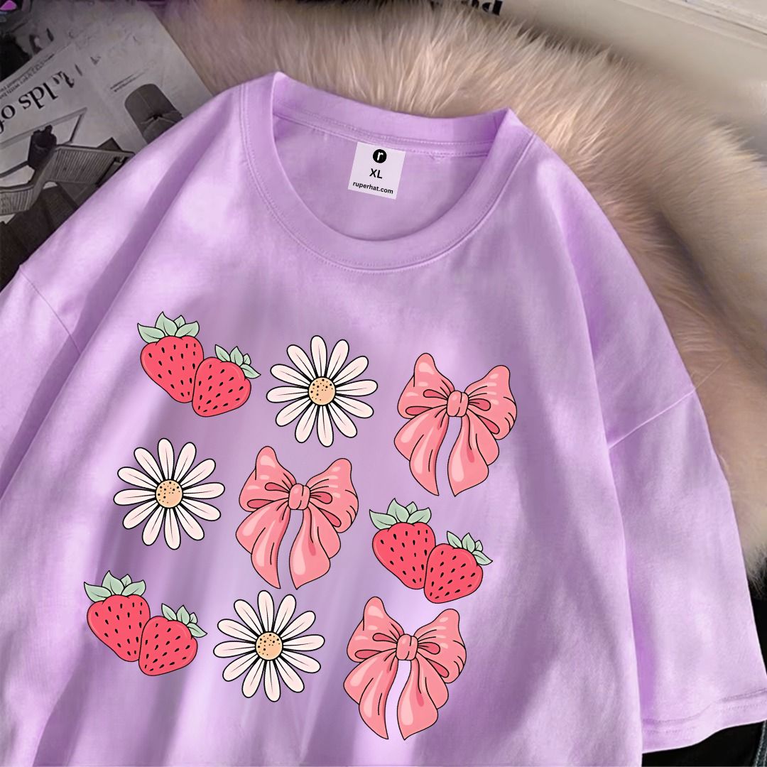 Rose Bow Strawberry Sunflower Design Drop Shoulder T-Shirt