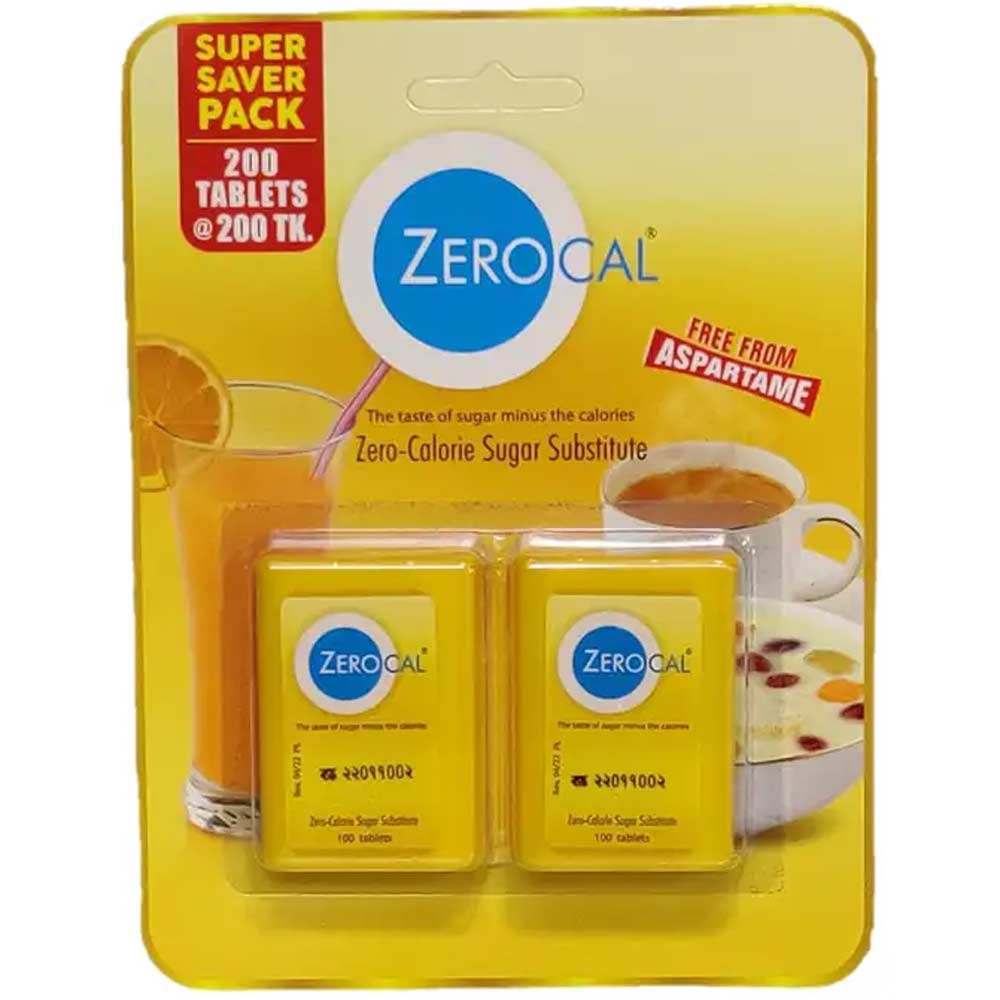 Zerocal Classic Tablet: Zero calorie sucralose based sugar substitute which is 600 times sweeter and safer than regular sugar. Its main ingredient, sucralose has no known side effects on health as tested in the last 20 years by over 100 scientific bodies and now has approval from apex regulatory bodies. It lets people to enjoy the sweet taste without the fear of calories. Also it is free from Aspartame. Simply Sweet taste, Sugarless.